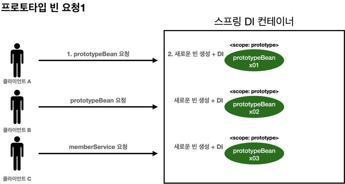 생성된다. 예를 들어서 clientA, clientB가 각각 의존관계 주입을 받으면 각각 다른 인스턴스의 프로토타입