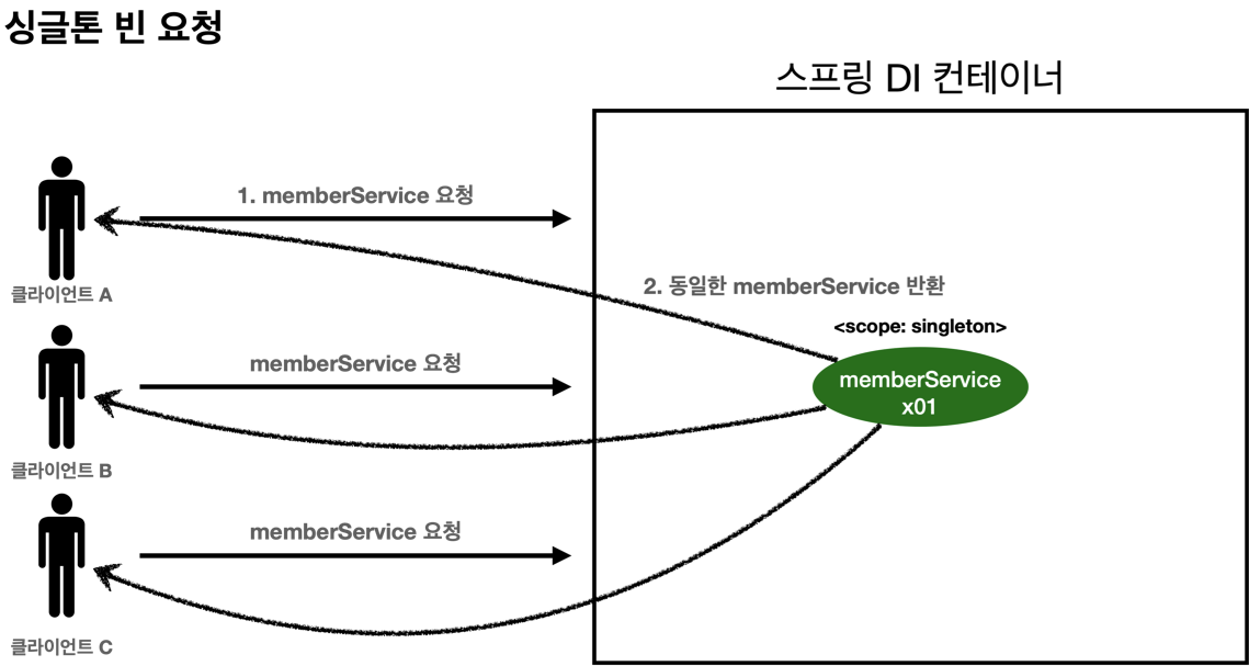2. 스프링 컨테이너는 본인이 관리하는 스프링 빈을 반환한다.(클라이언트 상관 없이 같은 빈을 반환함)