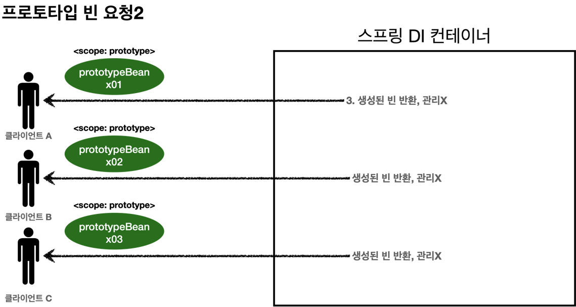 것이다. 클라이언트에 빈을 반환하고, 이후 스프링 컨테이너는 생성된 프로토타입 빈을 관리하지 않는다.